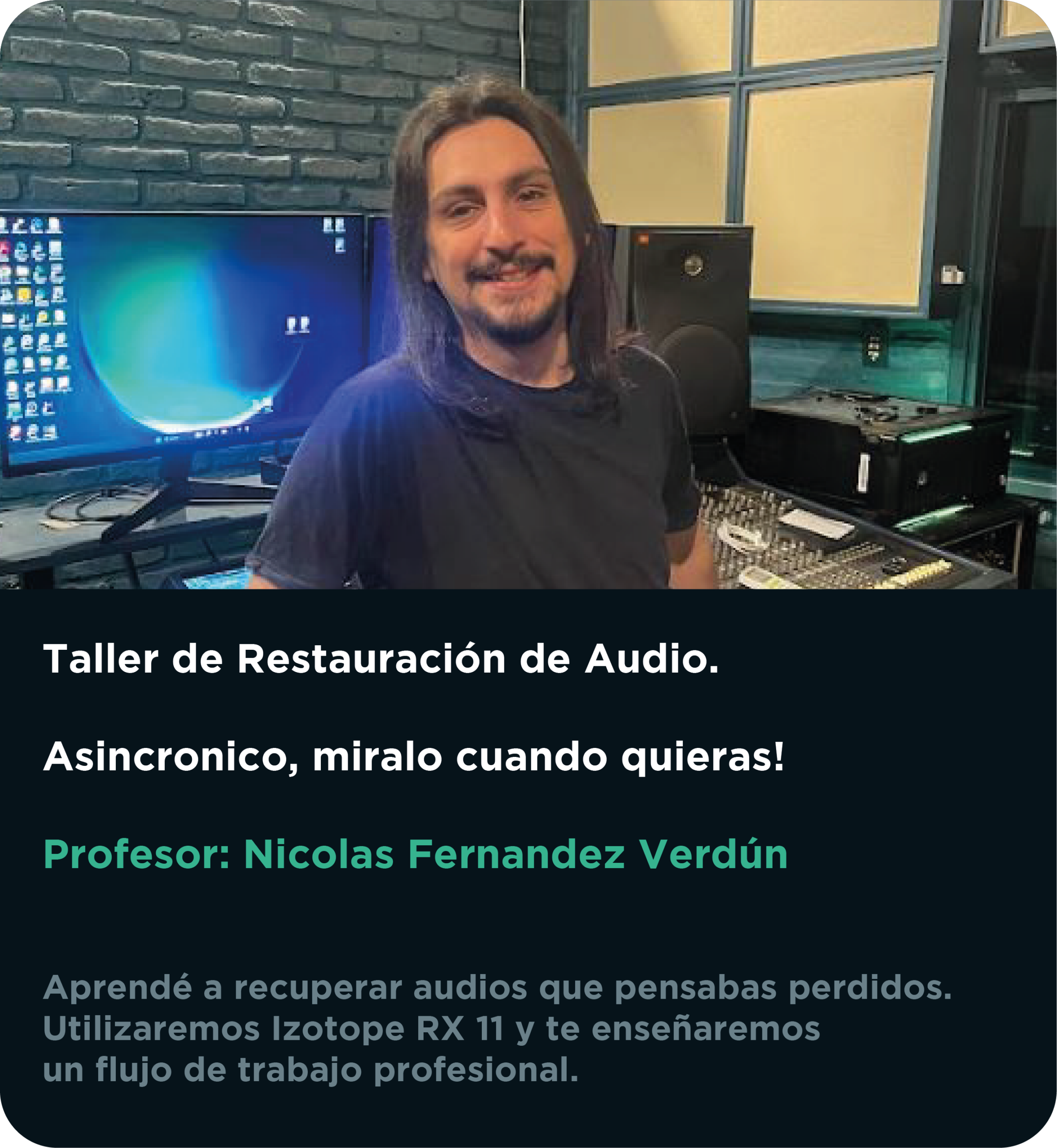 Totalmente recomendable para quienes buscan resultados de nivel profesional en restauración de audio. Nicolás es un excelente profesor. Gracias a sus clases aprendí a editar y recuperar audios dañados utilizando RX 11 de forma clara y profesional. Explica con precisión cada herramienta y cómo aplicarla en situaciones reales.